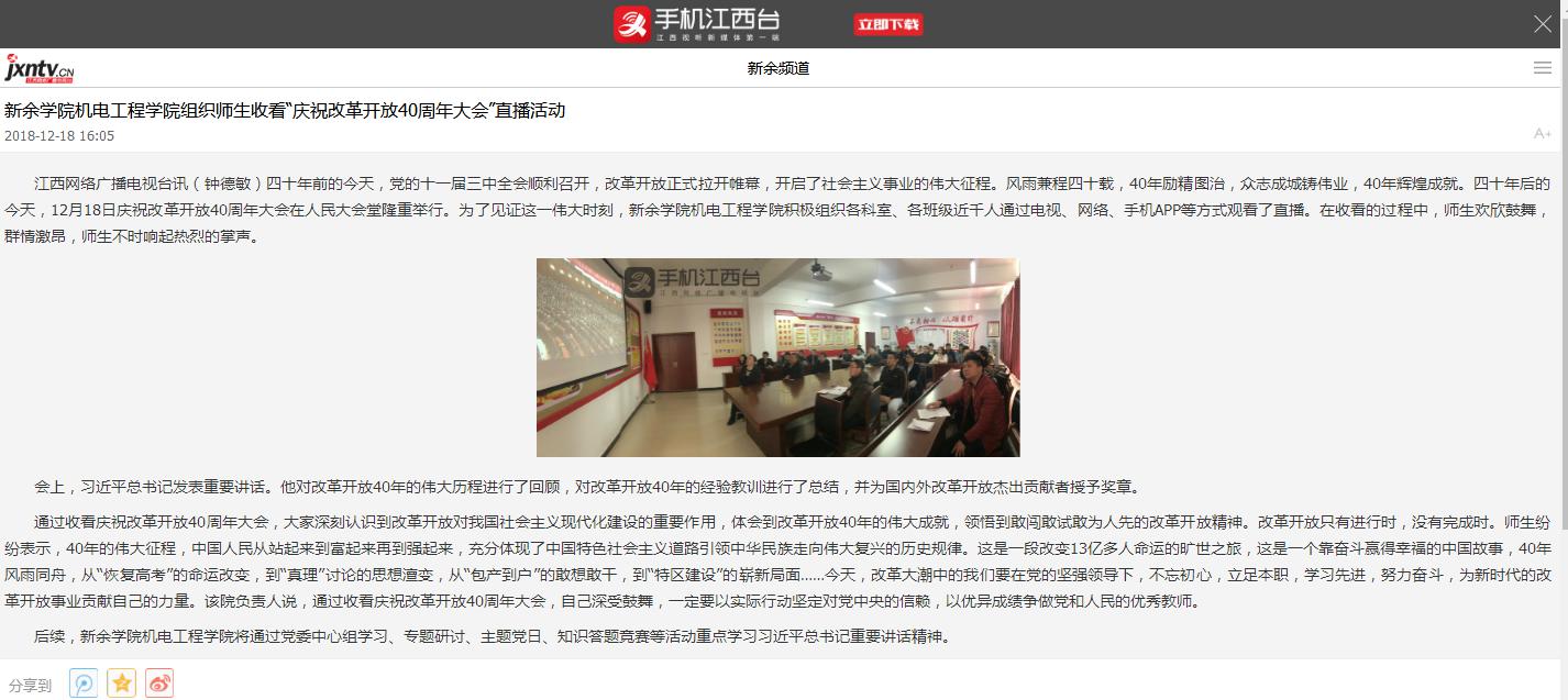 【媒体看机电-江西网络广播电视台】英国上市公司365组织师生收看“庆祝改革开放40周年大会”直播活动