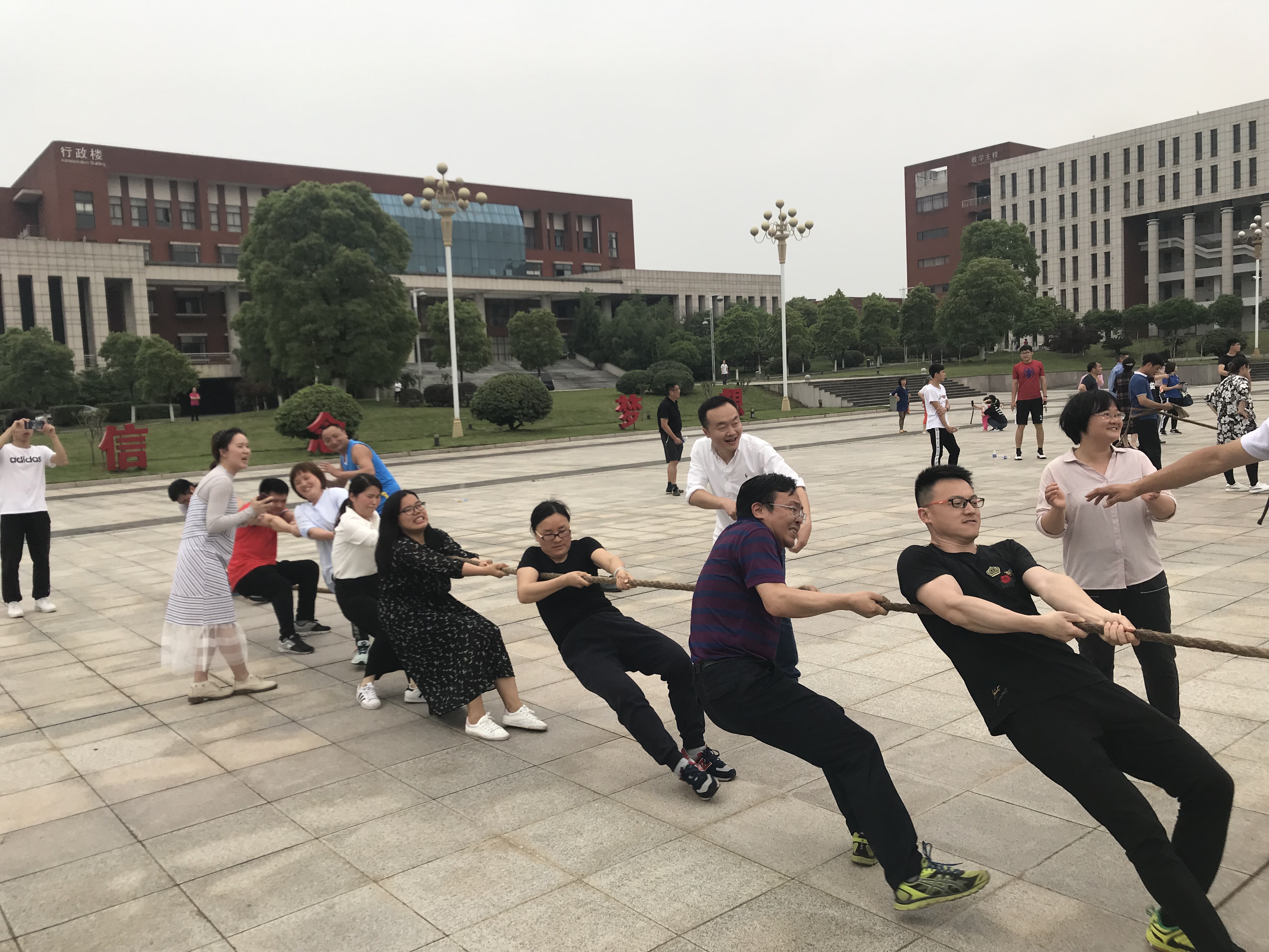 为迎接第五一”国际劳动节,营造公司教职工同心协力,团结拼搏的良好精神风貌,丰富教职工业余文化生活,增强教职工的身体素质,校工会于 4月26日下午在梦想广场举办了迎“五一”拔河比赛。