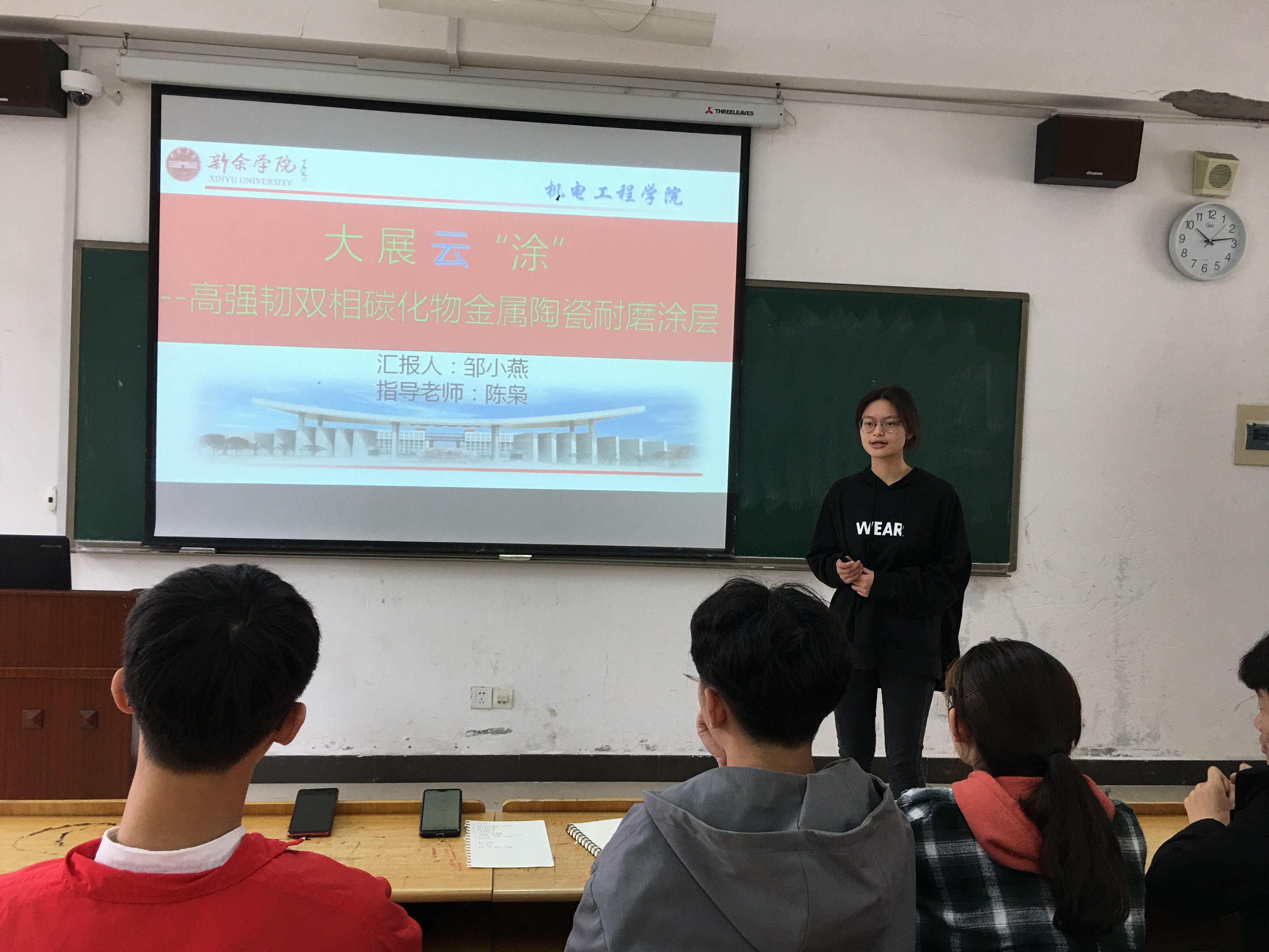 然后,协会成员根据指导老师安排及负责的项目内容及结合参加创新创业大赛或互联网+创新创业项目,分别作了“大展云“涂”—高强韧双相碳化物金属陶瓷耐磨涂层”、“金属材料表面耐磨涂层材料研制及设计”、“硼化物基金属陶瓷涂层组织结构与性能”、“WC-17Co金属陶瓷涂层组织结构与性能”等系列主题的学术报告,每次报告后协会成员均进行交流讨论,相互学习,互相提高。