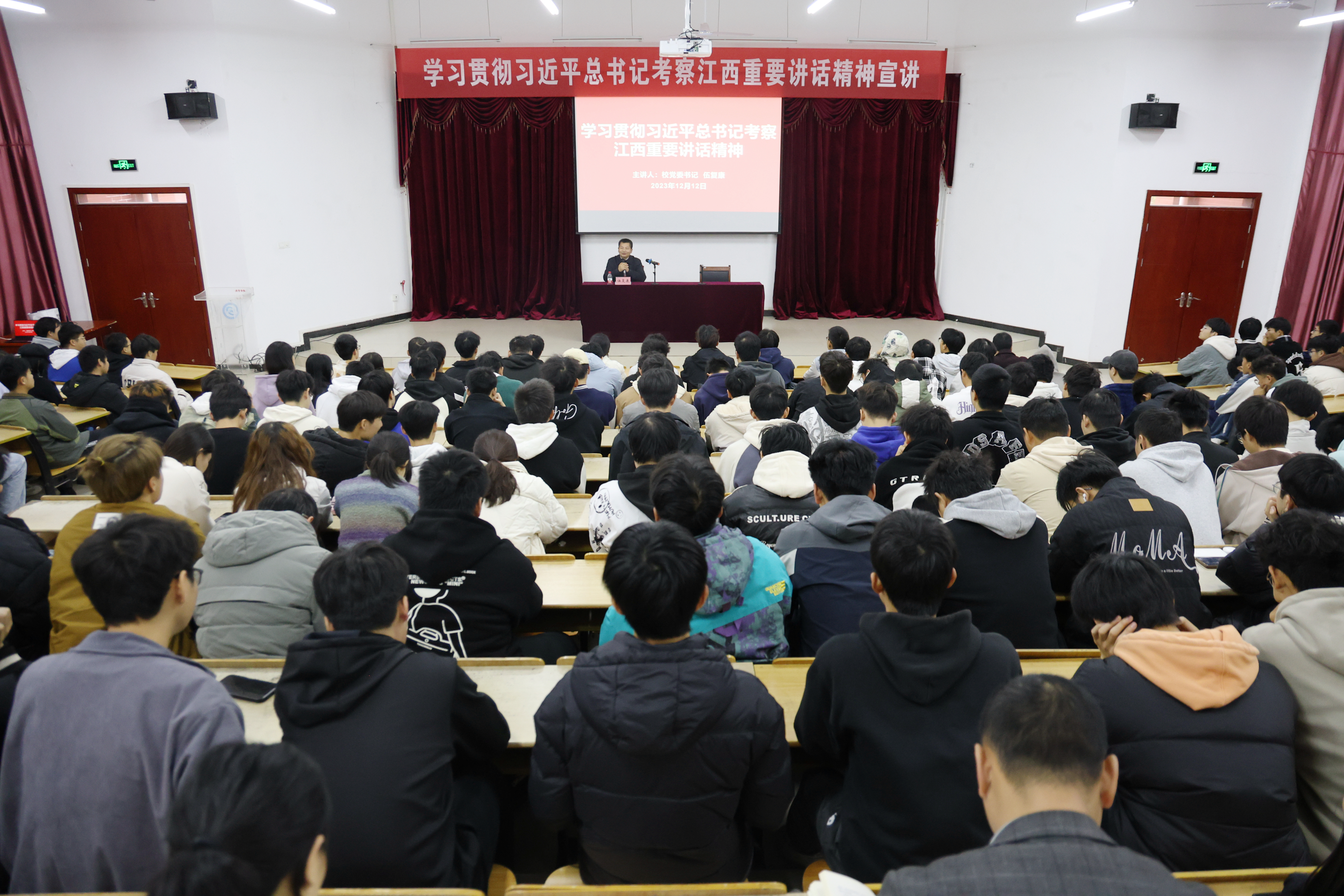 会上,伍复康书记以江西省情、认识江西、苏区精神及井冈山精神开篇,结合习近平总书记所讲的”努力在加快革命老区高质量发展上走在前“,”在推进中部地区崛起上勇争先“、”在推进长江经济带发展上善作为“三句话,从“深刻认识习近平总书记再次考察江西的重大意义”、”深刻理解习近平总书记考察江西重要讲话精神的丰富内涵“、”深刻把握学习贯彻习近平总书记考察江西重要讲话精神的实践要求,奋力谱写中国式现代化江西篇章“三方面入手,对习近平总书记考察江西重要讲话精神做了全面深入的解读。同时,伍复康书记结合江西经济社会发展的历史脉络、产业、传统文化和科技创新,用大量的事例和数据对江西的历史方位和未来发展进行了深入系统的阐述。最后,伍复康书记通过三个关键词:责任、机遇、行动对同学们寄予了深厚的期望。伍书记指出,新时代的老员工要以学习宣传贯彻习近平总书记考察江西重要讲话精神为强大动力,一是要勇挑时代重担,展现青年担当。要勇做走在时代前列的奋进者、开拓者、奉献者,在奋斗中释放青春激情、追逐青春理想。二是要把握时代机遇,争做有为青年。要勤于学习、善于学习、创新学习,在提高理论素养、知识学养和道德涵养上下功夫,珍惜学习机会,深化技能储备。三是竭力奋楫笃行、立志履践致远。青年学子要将个人理想追求融入国家发展中,立足自身、把握时代、拥抱未来,以时不我待的紧迫感和使命感不懈奋斗。
