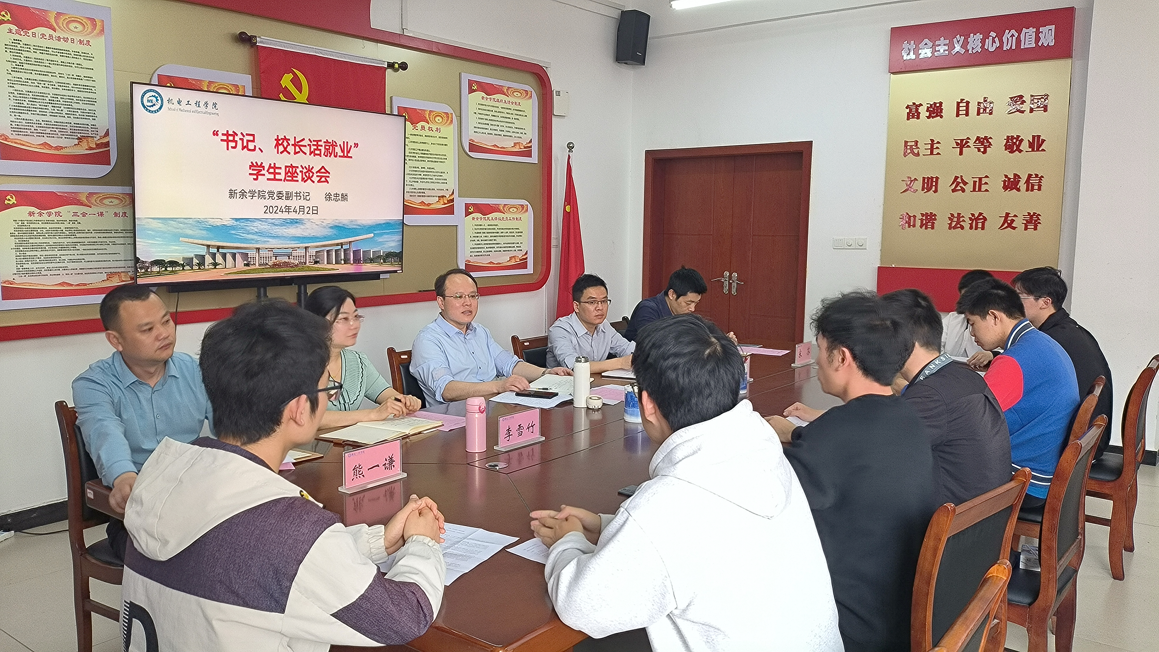 座谈会中,公司党委副书记宋苏介绍了本学院就业相关情况及目前就业形势。与会师生代表围绕就业帮扶典型案例、求职经验及考研、考公等经验与公司党委副书记徐忠麟进行互动交流。