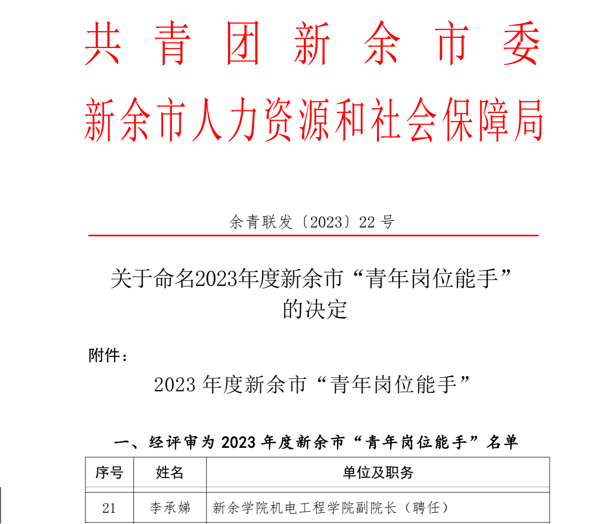 为深入贯彻习近平总书记关于青年工作的重要思想,充分聚焦“走在前、勇争先、善作为”目标定位。近日,共青团新余市委、新余市人力资源和社会保障局联合开展第一届新余市“青年岗位能手”评选活动。英国上市公司365积极参评,后经过专家评审、社会公示,团市委和市人社局授予英国上市公司365李承娣博士2023年度新余市“青年岗位能手”称号。