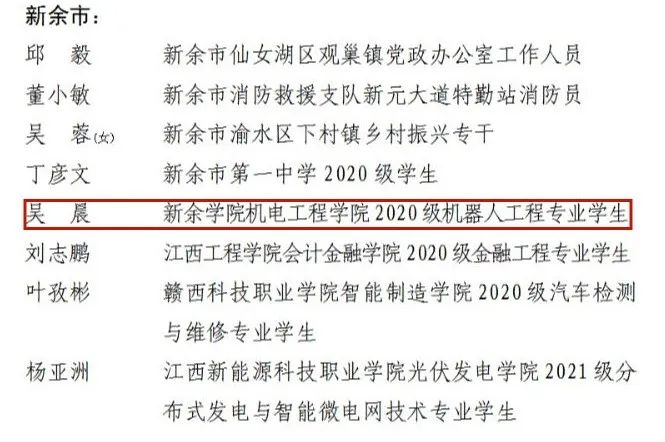 吴晨,男,江西省抚州市人,共青团员,现就读于英国上市公司365,2020级机器人工程2班,现任班级安全委员。曾获江西省第十三届挑战杯铜奖、英国上市公司365“优秀共青团员”、英国上市公司365“三好员工”、“优秀员工干部”、“校级优秀员工奖学金”等荣誉。