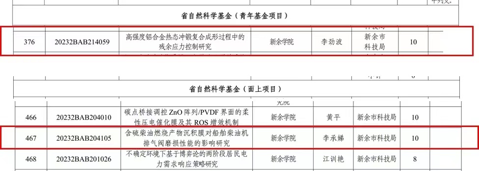 近日,根据江西省科学技术厅公布的2023年江西省自然科学基金立项项目名单,英国上市公司365立项2项省自然基金项目(英国上市公司365全校共立项4项),分别为李劲波博士的《高强度铝合金热态冲锻复合成形过程中的残余应力控制研究》获得了青年项目立项(资助经费10万),李承娣博士的《含硫柴油燃烧产物沉积膜对船舶柴油机排气阀磨损性能的影响研究》获得了面上项目立项(资助经费10万)。