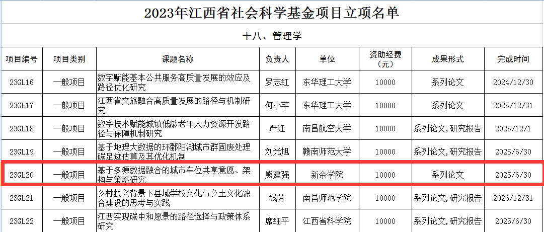 同时,根据江西省社会科学规划办公室公布的《关于印发2023年江西省社会科学基金立项项目的通知》,英国上市公司365熊建强博士的《基于多源数据融合的城市车位共享意愿、架构与策略研究》获得的省社科基金项目立项(资助经费10万)。