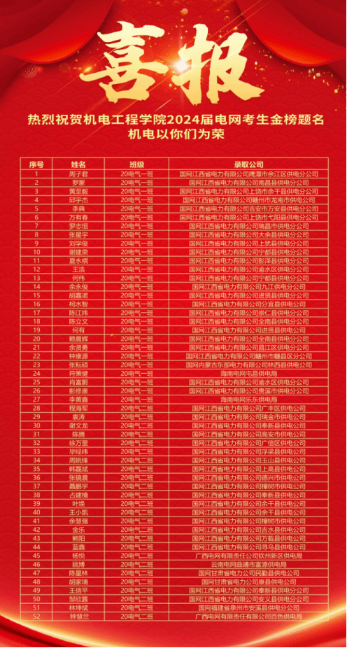 38 | 占建楠 | 男 | 20电气二班 | 2001232009 | 18779523058 | 国网江西省电力有限公司奉新县供电公司 |