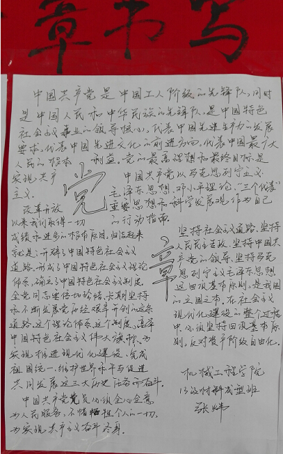 本次党章书写大赛主题为“书写信仰,书写青春”,比赛采取硬笔书写形式。大家在此次比赛中挑战了自己的书写能力,展示了书写水平,同时在不知不觉中深化了对党章内容的领悟,对党的纲领的理解。比赛评出了一等奖1名,二等奖2名,三等奖3名,优胜奖10名,对获奖作者进行了奖励,并进行了作品展示。