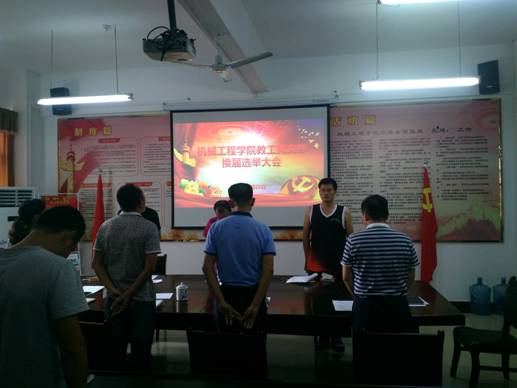 会议在庄严的国歌声中拉开序幕,并且严格按照相关程序完成换届选举任务。全体党员认真听取了上一届工作报告,一致表决通过。所有党员都认真慎重地提交了自己的选票。通过选举,洪云、宋苏、袁乐、傅建红、熊建强等五位同志当选为机械工程学院教工党支部新一届支委会委员。随后召开了第一次支委会会议,选举洪云同志为党支部书记。