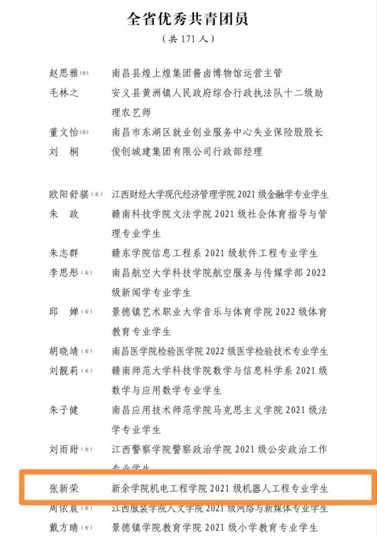 4月30日,共青团江西省委发布《关于表彰2021年度“全省优秀共青团员”“全省优秀共青团干部”“全省五四红旗团委(团支部)”的决定》。英国上市公司36521级机器人工程专业员工1班张新荣同学荣获“全省优秀共青团员”荣誉称号。