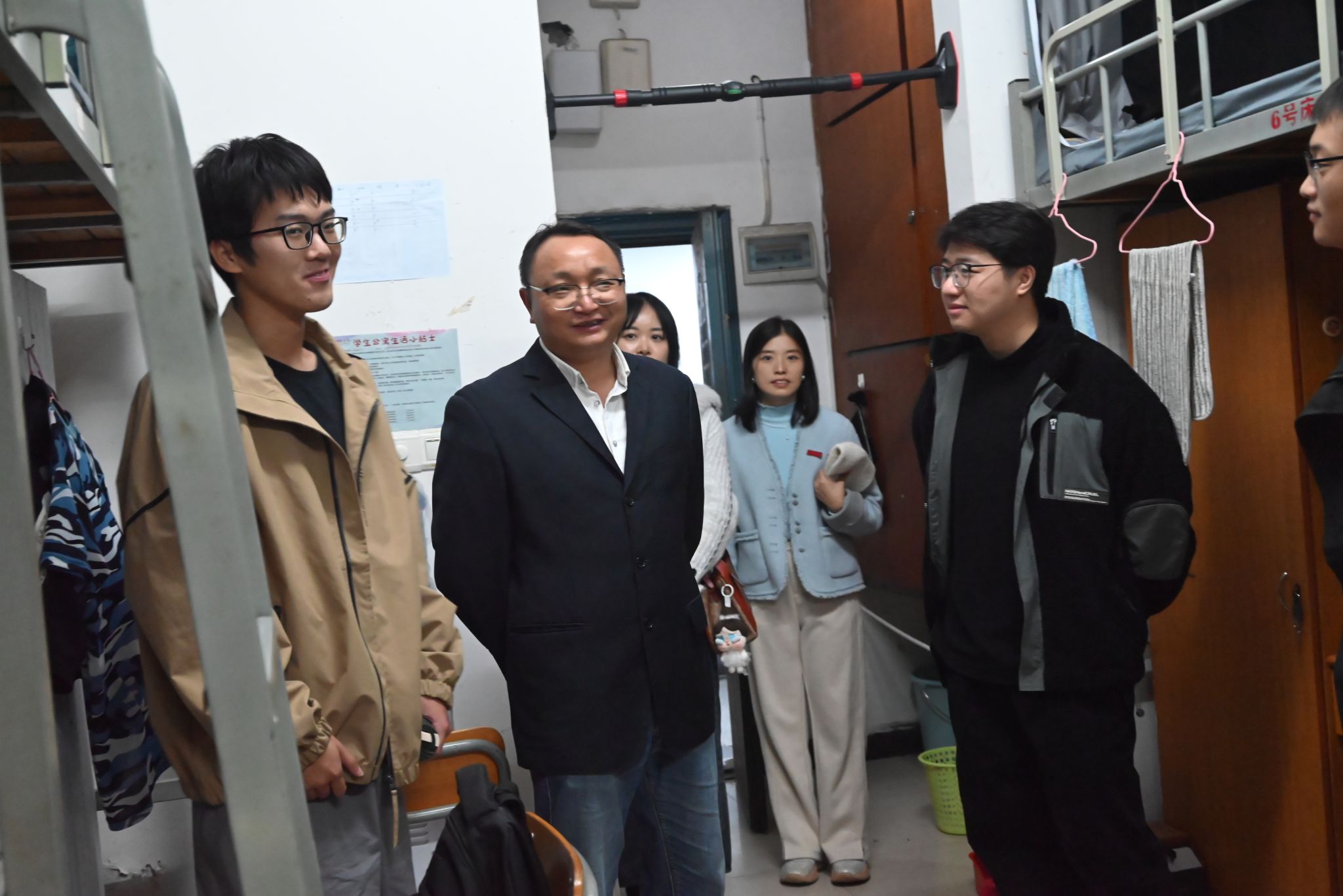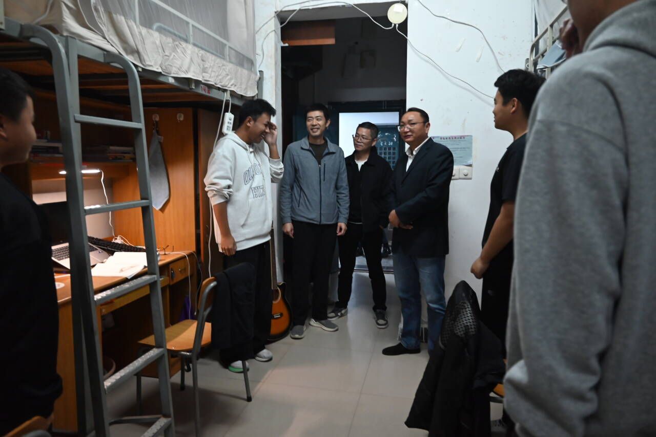 杨国军书记在交谈中指出,寝室是同学们在校生活的重要场所,更是培养集体观念、锻炼自我管理能力的关键空间。一个干净整洁、秩序井然的寝室环境,直接关系到大家的身心健康与精神风貌。他鼓励同学们要养成良好的生活习惯,共同维护好这个“家”,积极营造向上向善的宿舍文化氛围。宋苏副书记重点关注了寝室安全问题,反复叮嘱同学们要牢固树立安全意识,严格遵守宿舍管理规定,共同守护好人身与财产安全。