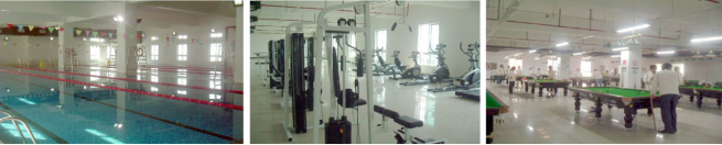 (大型室内游泳池) (设备齐全的健身房) (宽敞明亮的员工台球室)