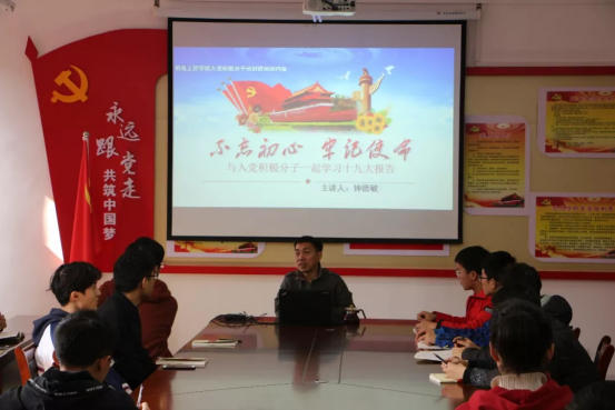 此次培训共为期三天,依次由祝超超老师、钟德敏老师、廖露亮老师担任培训授课员。内容围绕党章、党的基本知识、党员的权利与义务,希望大家尽快转变身份,从党的助手及后备军转变为入党积极分子;全方位学习十九大报告精神,与时俱进,不断学习党的最新理论知识,保持党员先进性,以自身的实际行动来诠释何为入党积极分子。 理论学习课结束后还将进行结业考试,评选出优秀学员。